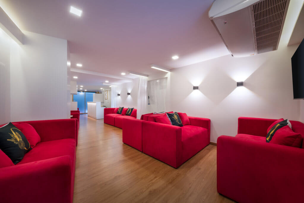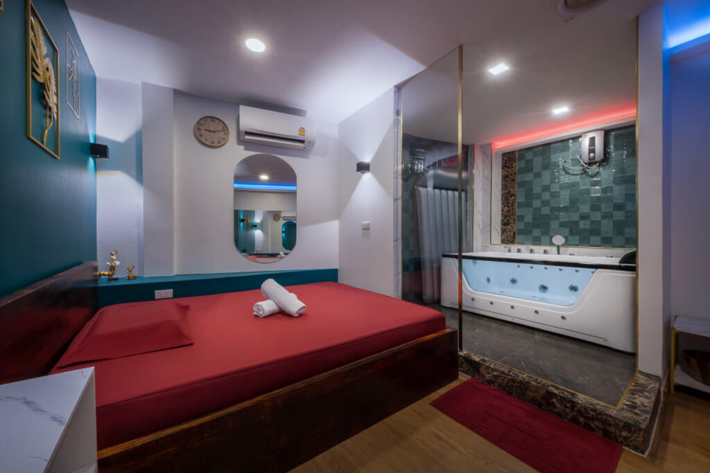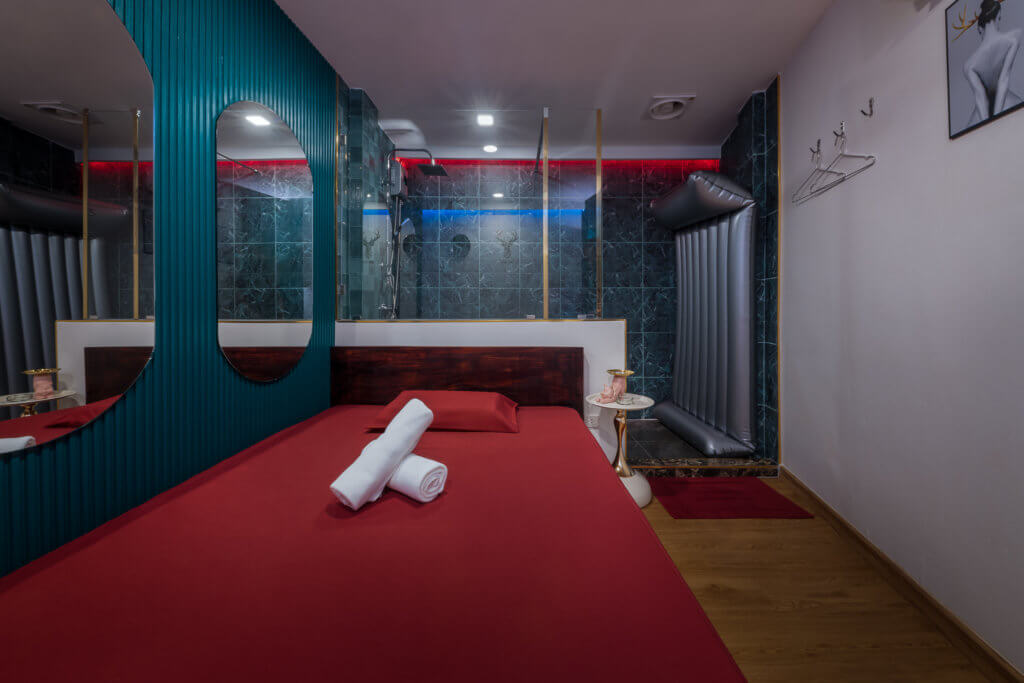 日本製のエアベッドやラグジュアリーなラブソファなど、こだわりの設備が非日常を演出。